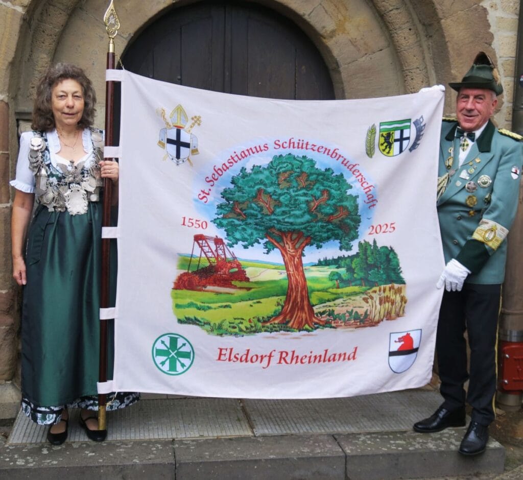 Zu ihrem 475-jährigen Jubiläum hat die St. Sebastianus Schützenbruderschaft Elsdorf eine neue Bruderschaftsfahne angeschafft. Brudermeister Wolfgang Nagel erläutert: „Ihr Motiv hat mit dem Blick in den hiesigen Braunkohletagebau Hambach einen Heimatbezug und ist schon deshalb ein Unikat.“