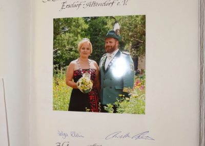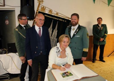 Bürgermeister Bert Spilles unterstützte die Wichtigkeit der Schützen, indem Helga u. Christian Klein sich ins Goldene Buch der Stadt Meckenheim eintragen durften.
