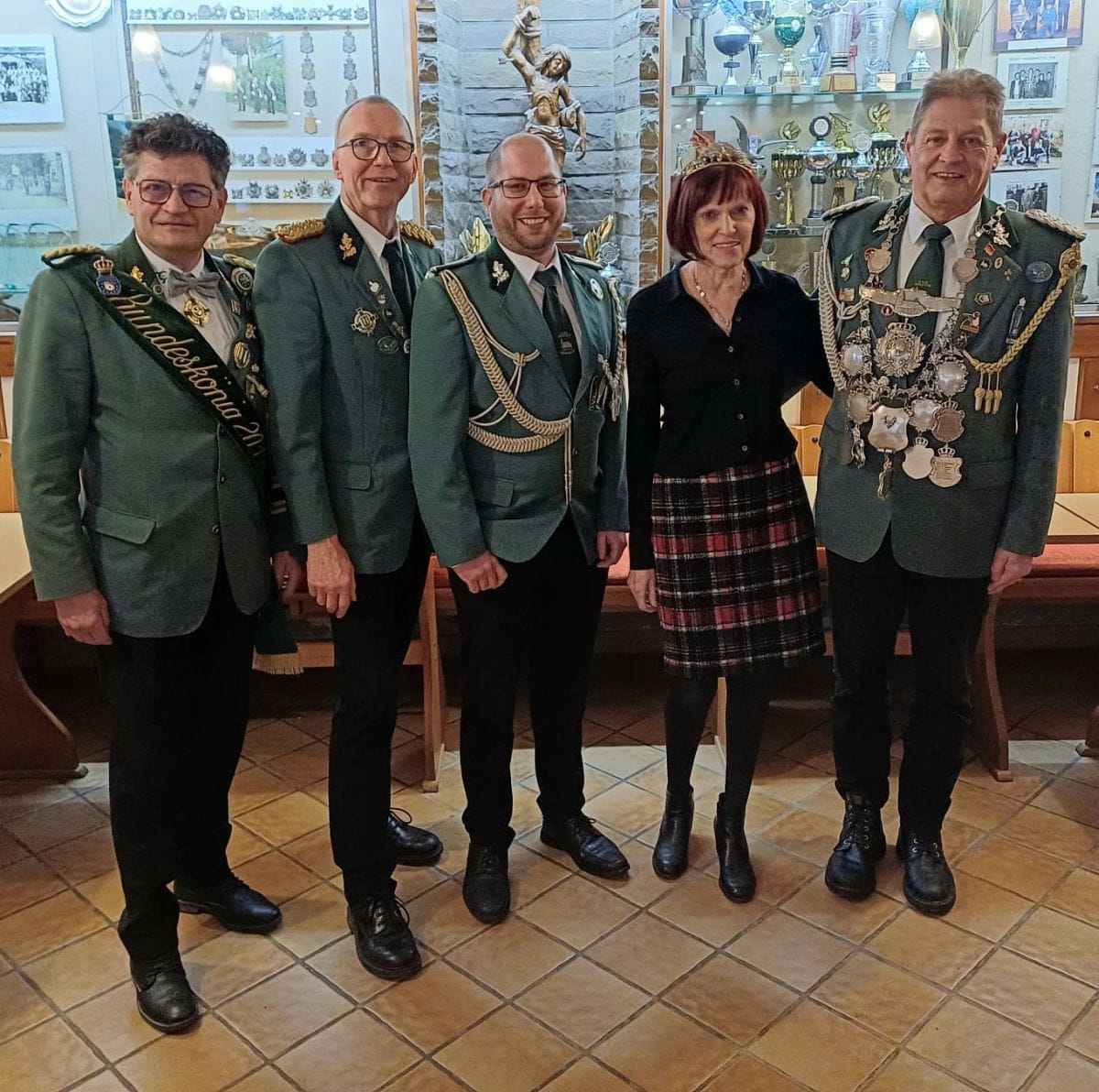 Bild: (von links) Stellv. Brudermeister Robby Nitsch, Brudermeister a.D. Jürgen Becker, Brudermeister Mathias Schumacher, Königin Elisabeth Lumme, König Hans-Jörg Schmitz