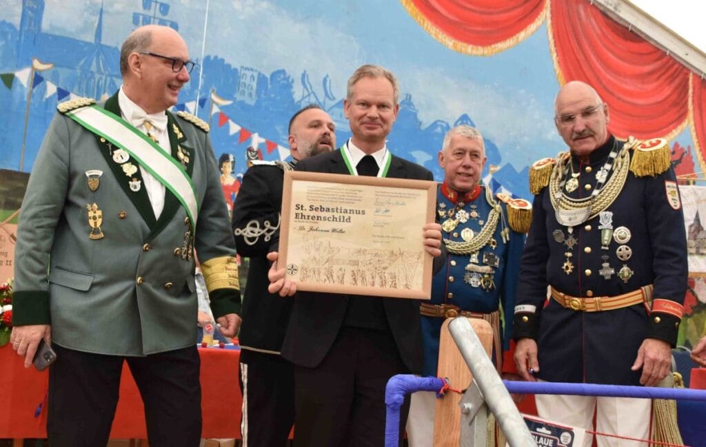 Mit dem Schulterband zum St. Sebastianus Ehrenkreuz ist der Bezirksbundesmeister des Bezirksverbands Sülztal Ernst-Guido Janßen für seinen herausragenden Einsatz in seiner Heimatbruderschaft St. Hubertus Schützenbruderschaft Kürten Olpe und im Bezirksverband ausgezeichnet worden.